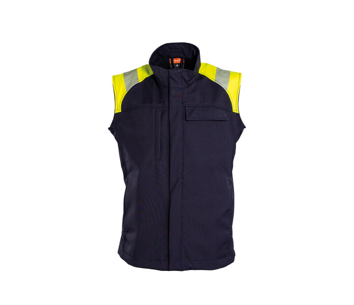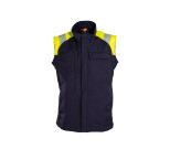 Non-Metal, wind and water resistant Inherent Flame Retardant softshell waistcoat with increased visibility.