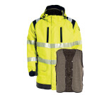 The parka is ergonomically shaped for work with raised arms. Concealed front zip and double stormflap with press studs. Detachable and adjustable hood. Chest pockets with zip. Keyring holder. Front pockets with flaps. Pockets with fleece lining. Sleeve pocket with flap, hidden keyring holder and strap for ID-pocket. Two inside pockets with zip, one for documents/Ipad with an integrated mobile phone pocket. Adjustable sleeve width and inside knitted cuffs. Drawcord at the waist and bottom of the parka. HTFR Dobby at the bottom and on the sleeves. Heat sealed reflective stripes for greater comfort. *The garment is tested in a 3 layer system together with basic underwear. Tranemo recommend underwear 5920/5940 and 5980.